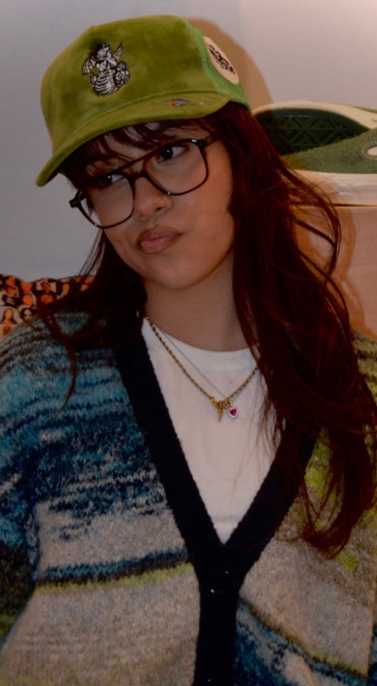 Olive Green Velvet Trucker Hat with Patched Embroidery.